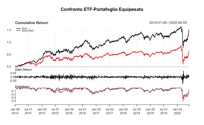 Nell’ETF Vonovia ha un peso vicino al 20% e DW il 10%, gli altri seguono con circa il 5%. Creiamo ora un portafoglio equipesato dei 5 componenti, ribilanciato annualmente: