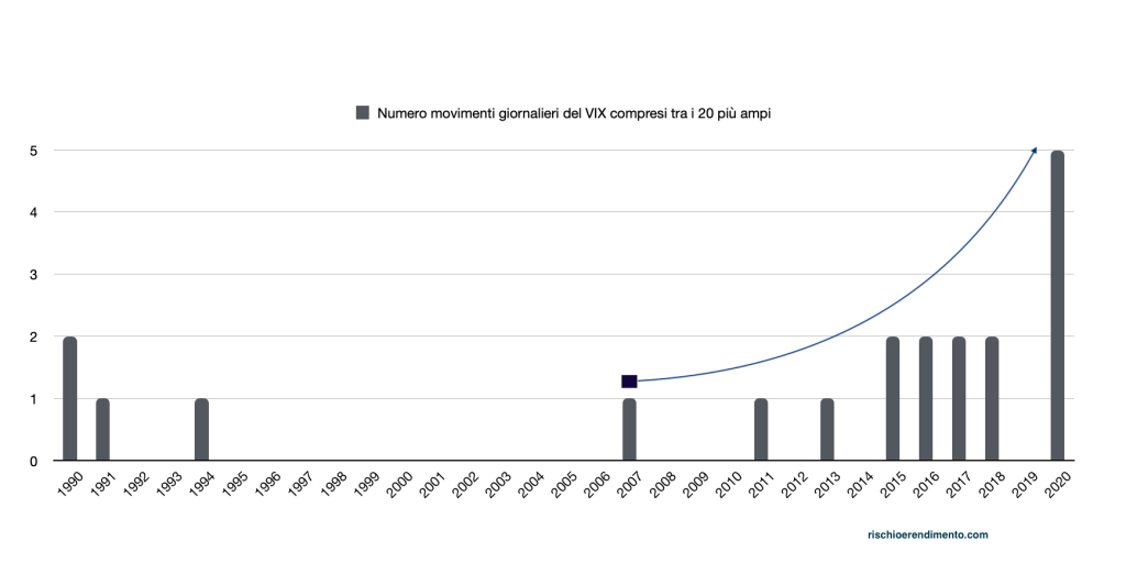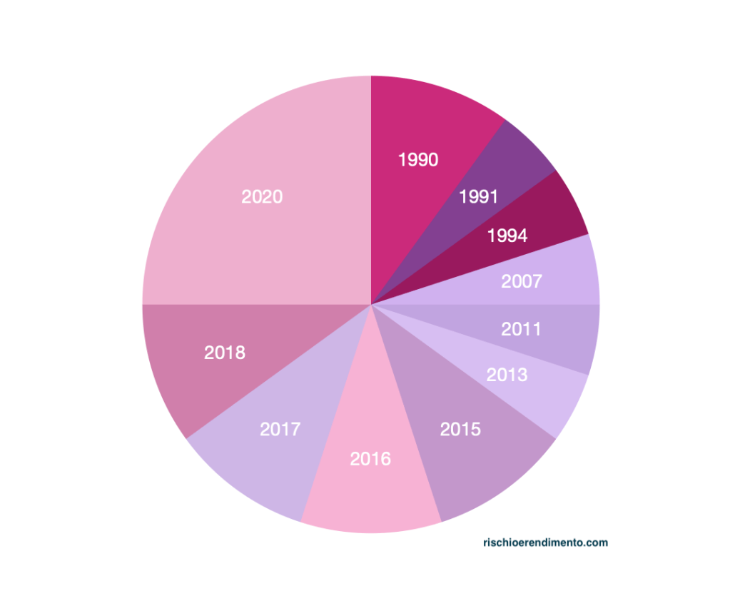 Possiamo notare che dal 2011 abbiamo avuto il 75% delle maggiori variazioni giornaliere e solo nel 2020 il 25% del totale, come tutto il periodo compreso tra il 1990 e il 2010.