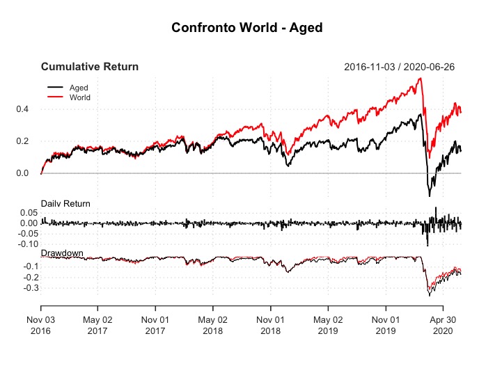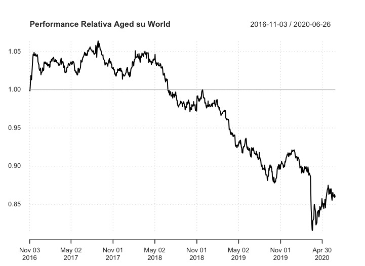 Tra fine 2016 e metà 2018 l’Aged ha sovraperformato il World, ma poi l’indice globale ha recuperato e ha anche tenuto meglio nella crisi di inizio 2020.