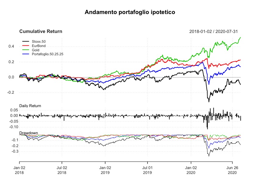 Cosa ci dicono questi movimenti? Che la paura non è passata e che si cerca ancora protezione in oro e titoli di stato, magari per solo una parte del portafoglio. Ipotizziamo di aver investito a gennaio 2018 in un portafoglio molto semplice, poco diversificato ma coerente con le conoscenze di un risparmiatore europeo/italiano; questo portafoglio è esposto al 50% sull’azionario europeo (che ex-post si è rivelato uno degli investimenti peggiori) e al 50% equamente diviso tra LGOV e PHAU. Questo portafoglio ha comunque beneficiato della diversificazione è si è comportato bene nel crollo di fine 2018 e ha ridotto le perdite in quello di inizio 2020.
