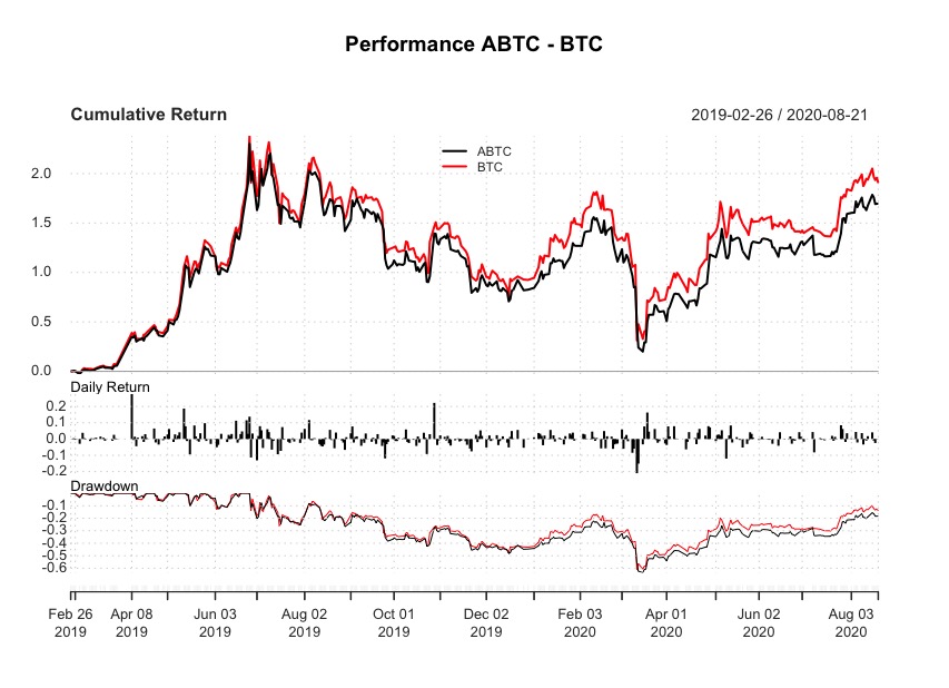 ABTC ha una correlazione con BTC/€ sui rendimenti giornalieri cosi ottenuti pari a 0.73, mentre passando a quelli settimanali otteniamo 0.94 (ricordo che una alta correlazione non corrisponde però a una performance identica).