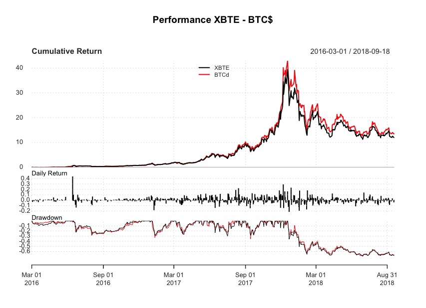 XBTE ha una correlazione con BTC/$sui rendimenti giornalieri cosi ottenuti pari a 0.62, mentre passando a quelli settimanali otteniamo 0.85.