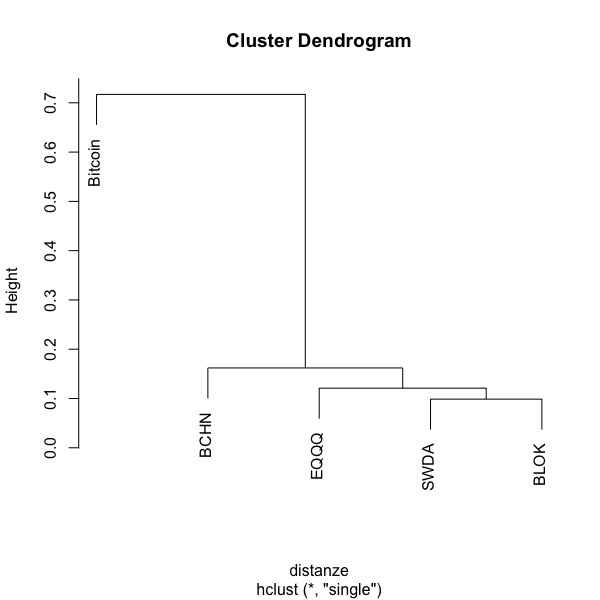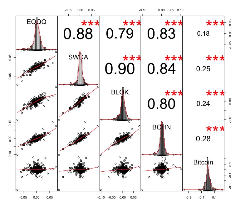 Confrontati con il Nasdaq (EQQQ ETF) e l’azionario globale (SWDA ETF) vediamo come l’Invesco Elwood Global Blockchain UCITS ETFs i comporti in maniera simile al primo mentre BLOK al secondo. Entrambi i prodotti sulla blockchain hanno bassa correlazione con il cambio BTC-EUR (dati giornalieri). In un precedente articolo parlo di come ci siano anche ETP per investire sul bitcoin e la loro correlazione col cambio.