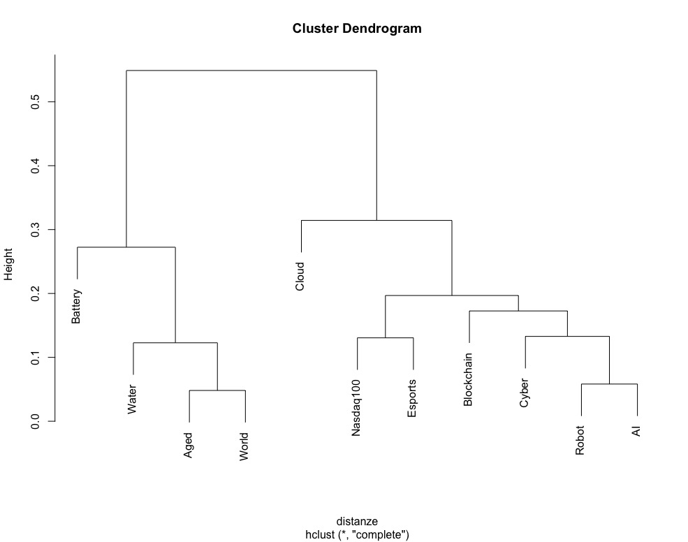 Una tabella cosi ampia può sicuramente essere di difficile lettura perciò calcoliamo le distanze e creiamo un diagramma ad albero per proporre una possibile gerarchia degli ETF tematici (basandoci solo sulla correlazione sui rendimenti giornalieri).