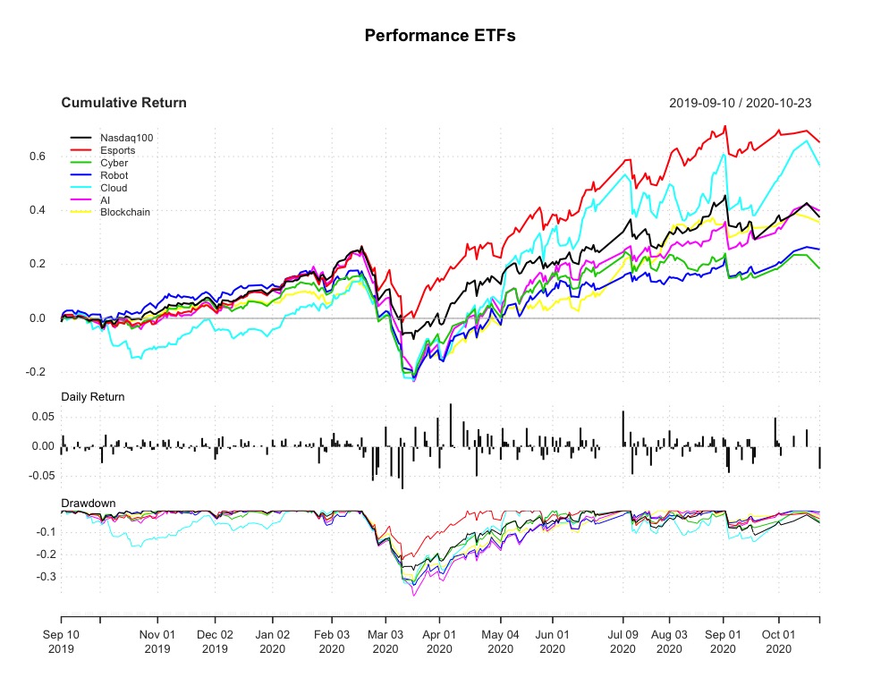 In questo confronto confronterò tutti gli ETF tematici (tranne MILL dato il poco storico) con il Nasdaq 100 e l’indice azionario mondiale (iShares World ETF: SWDA). L’analisi partirà dal settembre 2019, data da cui sono quotati buona parte degli ETF tematici analizzati.