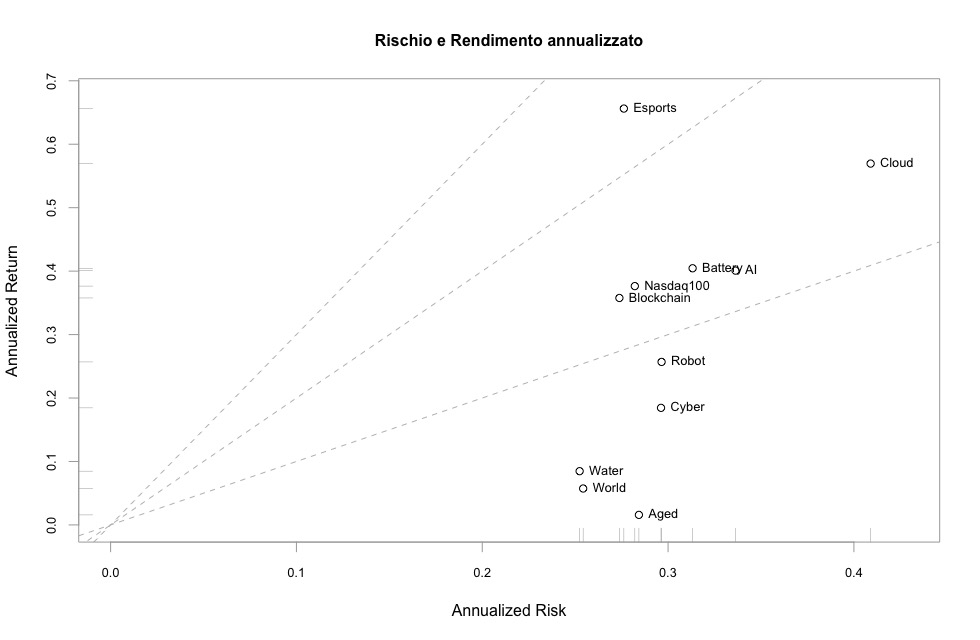 I due con le performance migliori sono WisdomTree Cloud Computing e il Vaneck vectors video gaming and esports, mentre WTAI e BCHN hanno un comportamento simile al Nasdaq.