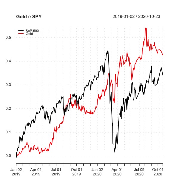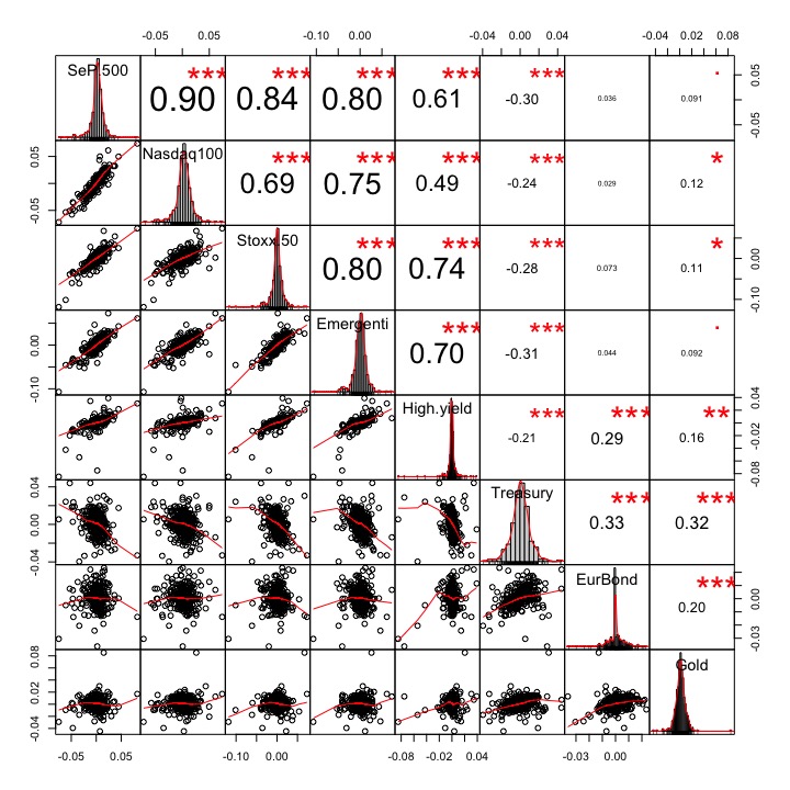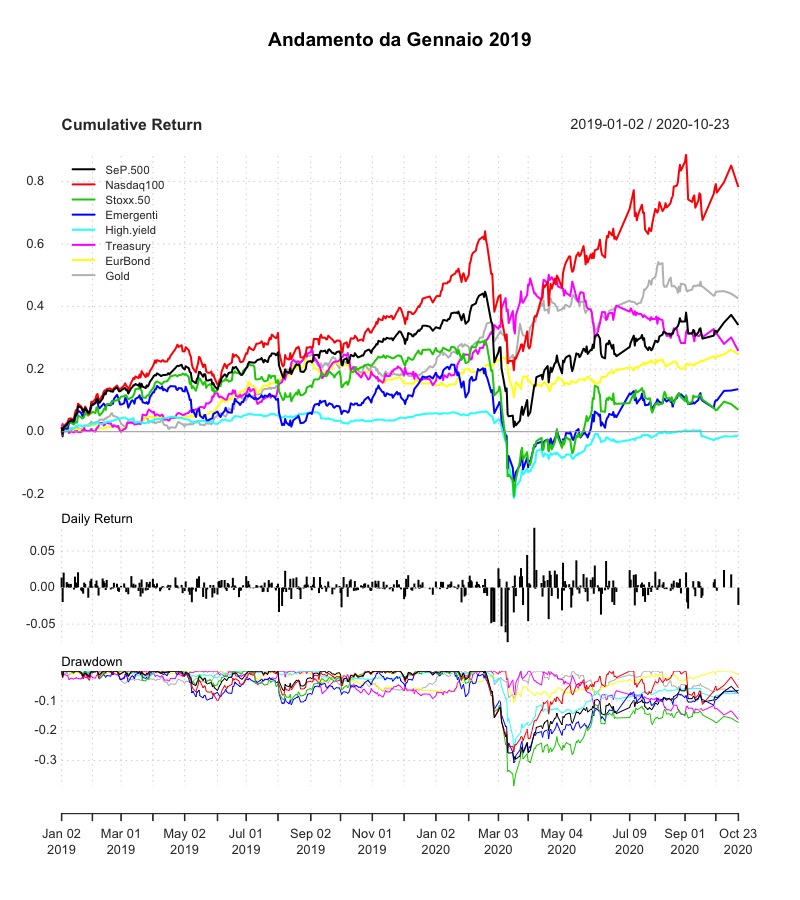 Abbiamo visto che nella creazione di portafogli efficienti si cercano strumenti finanziari con un valore atteso positivo ma con bassa correlazione. Vediamo come si siano mosse da gennaio 2019 alcune categorie (Azionario USA, EU e Emergenti, Oro, High Yield e titoli di stato) sia in maniera assoluta che in rapporto una all’altra. Per l’analisi utilizzerò i seguenti ETFs: