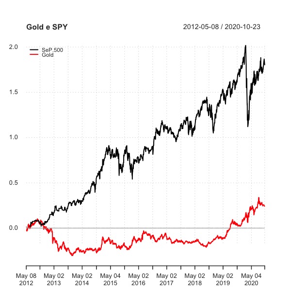 Prima di riempire i portafogli di oro ricordo l’andamento del metallo giallo rispetto all’azionario dal 2012. Da ottobre 2012 a dicembre 2013 l’oro ha perso (per l’investitore in Euro tramite PHAU) il 37%, recuperando solo a fine gennaio 2020.