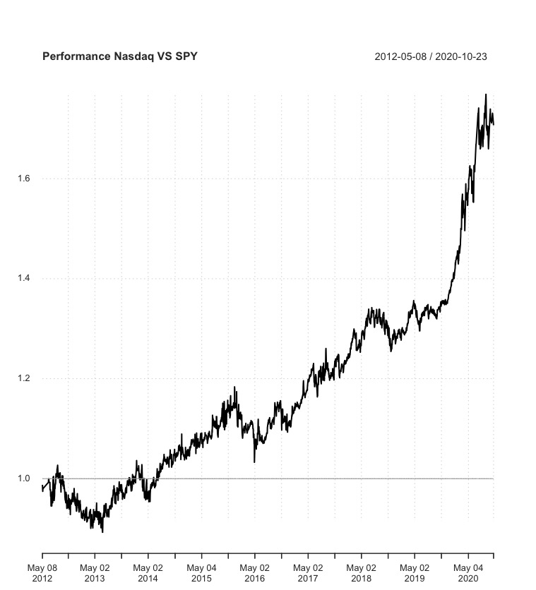 Rispetto all’analisi di luglio ho inserito anche il Nasdaq che continua la sua overperformance sull’S&P500 iniziata nel 2014