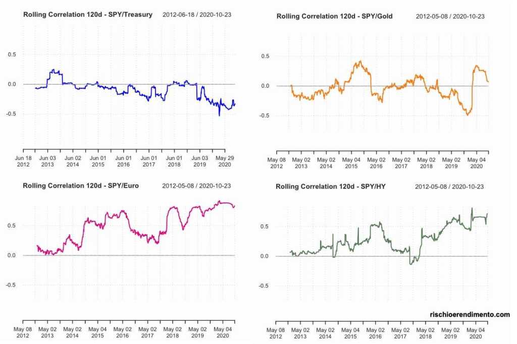 Vediamo la correlazione a finestra mobile (120 giorni) del mercato americano (SPDR S&P 500) rispetto a: