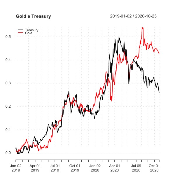 Vediamo l’andamento dell’oro da gennaio 2019 rispetto a Treasury e S&P500, in cui vediamo il suo buon andamento e come da luglio 2020 non si muova più come i titoli di stato americani, scontando probabilmente un aumento della inflazione futura.
