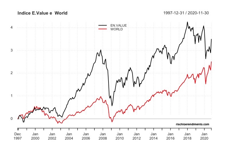 Guardiamo pero al lungo periodo attraverso i dati degli indici MSCI, ovvero dal 1997 da quando è calcolato il MSCI World Enhanced Value.