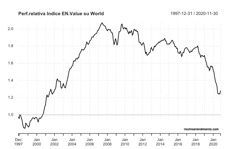Se osserviamo la performance relativa del E.Value sull’indice classico si nota che la sovraperformance dal 2001 sia stata quasi completamente persa partendo dal 2011 e sopratutto dal 2018.