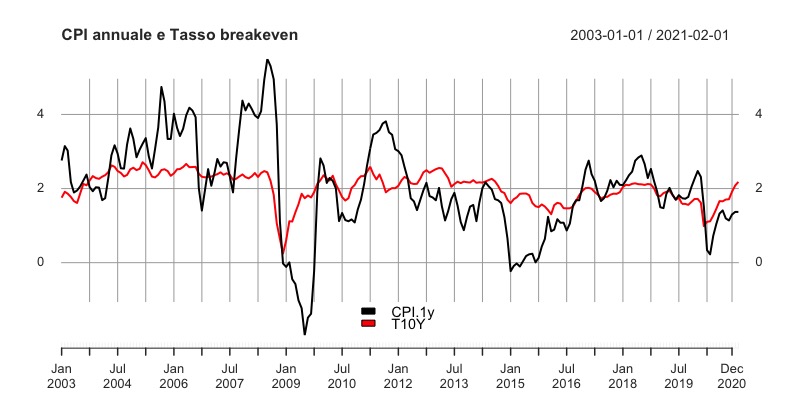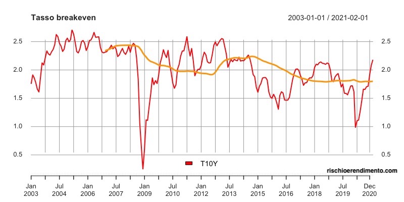 Se vediamo l’andamento del tasso breakeven anche nel 2009 ha anticipato la reflazione post crisi, ma poi entrambi i tassi si sono fermati tra il 2 e il 4%.