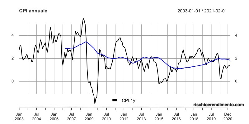 In sintesi al momento negli USA l’inflazione anno su anno è diretta al 3% per poi probabilmente scendere, anche se vi fosse un periodo di 9-12 mesi sopra i 3% non sposterebbe molto la media mobile rispetto al recente andamento. Salvo manovre particolarmente espansive o shock l’inflazione USA non dovrebbe raggiungere livelli elevati. Resta comunque valido lo studio postato sopra, ricordando alcune cose: