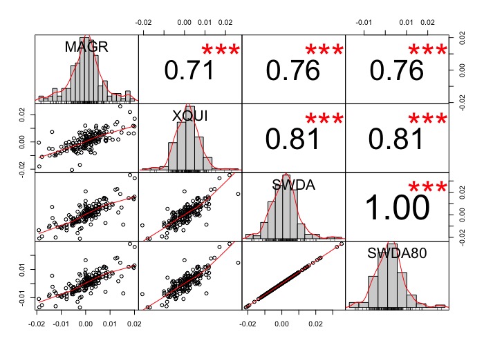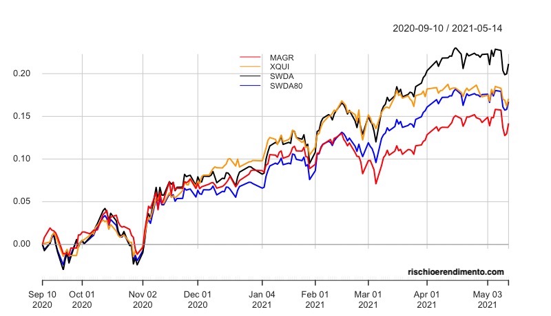 Come vediamo il MAGR ha una correlazione di 0.70-0.76 rispetto all’azionario globale e all’altro flessibile. XQUI mostra nel periodo una maggiore correlazione con l’indice World di MAGR anche se la sua componente media di azionario dovrebbe essere minore. Da notare che l’Xtracker Portfolio non ha titoli di stato USA ma EU e Cina.