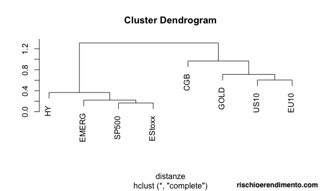 La correlazione tra i rendimenti dei singoli ETF mostra la divisione tra asset rischiosi maggiormente correlati tra loro (quali Azionario USA, EU e Emergenti ed i bond High Yield) e quelli conservativi quali i titoli di stato Risk Free e l’Oro. Tra i risk free sono inseriti anche i bond cinesi , che come vediamo in questo diagramma a albero rimangono lievemente staccati da quelli classici ma questo fatto è più da attribuirsi alla diversa duration.