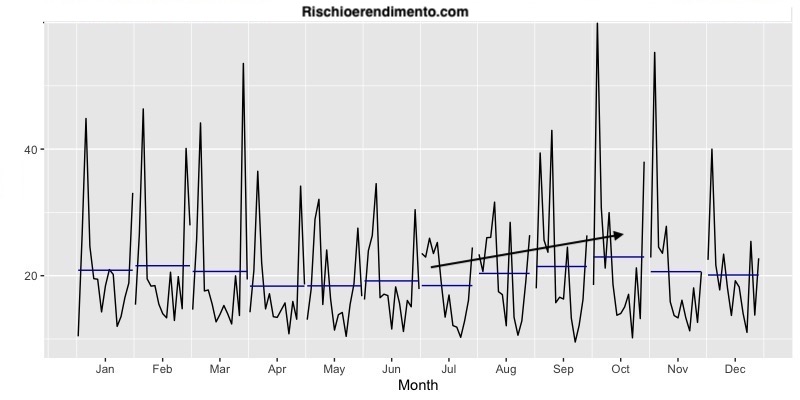 Infine uno sguardo alla stagionalità del Vix dal 2007. Vediamo come a partire da luglio fino ad ottobre si assista in media a una aumento della volatilità sopra il valore di 20 che è un po’ lo spartiacque tra la normalità e i periodi di stress.