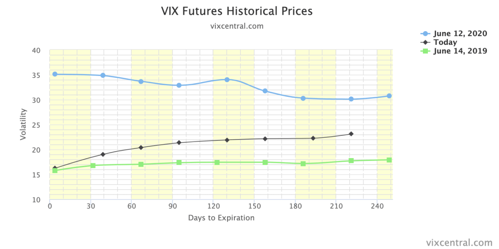 Concludo con la volatilità: prima un confronto della struttura a termine del VIX tra giugno 2019, 2020 e 2021. Il VIX è una misura della volatilità implicita a 30 giorni nelle opzioni S&P 500. In parole povere, considera il costo delle put e delle call sullo S&P500 e lo trasforma in un numero. Possiamo considerare un livello VIX inferiore a 12 come basso, un livello superiore a 20 come alto e un livello intermedio come normale.