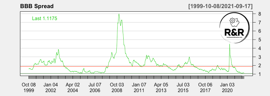 Gli ICE BofA OAS sono gli spread calcolati tra un indice di tutte le obbligazioni in una data categoria di rating e una curva spot del Tesoro ovvero vediamo la differenza tra i tassi dei corporate BBB e il tasso senza rischio del tesoro americano.