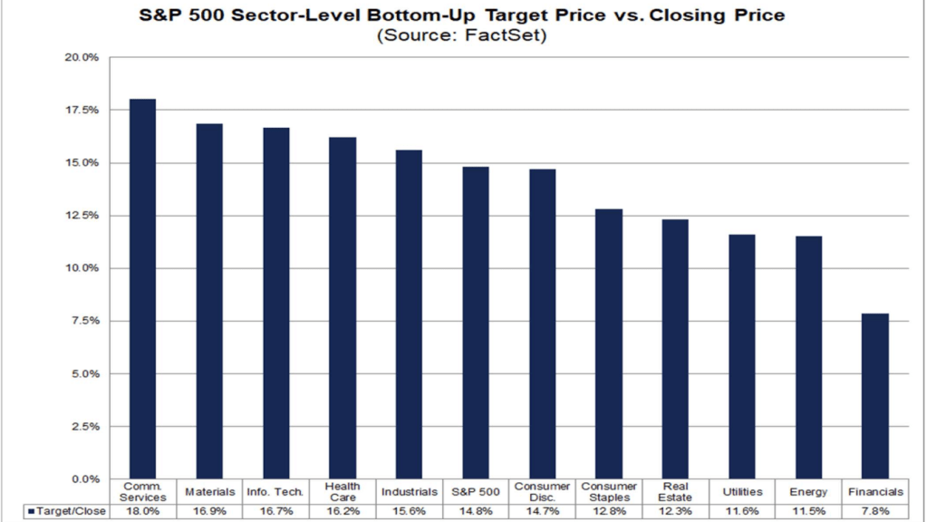 FactSet Research Systems riporta che gli analisti prevedono che l’S&P 500 vedrà un aumento dei prezzi dell’14.8% nei prossimi dodici mesi. Questa percentuale si basa sulla differenza tra il prezzo obiettivo bottom-up e il prezzo di chiusura dell’indice. Il prezzo obiettivo bottom-up è calcolato aggregando le stime del prezzo obiettivo mediano per tutte le società nell’indice. Il 7 ottobre il prezzo target prezzo obiettivo bottom-up per l’S&P 500 è pari a di 5051 (a luglio il prezzo obiettivo bottom-up a 12 mesi era di 4803).