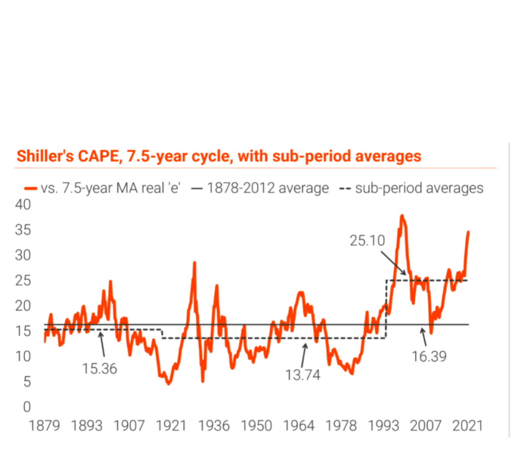 Secondo TS Lombard, i potenziali rendimenti reali sull’S&P sono inadeguati, dati i rischi visto che il CAPE è del 38% al di sopra della sua media post-guerra fredda (post-1991); sotto vediamo un grafico dell’andamento del CAPE rispetto al ciclo economico di 7.5 anni con i valori medi di alcuni sotto-periodi.