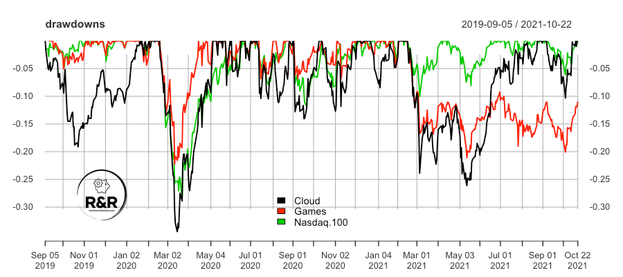 A livello di drawdown (correzione dai massimi) notiamo come Sia prima il NAsdaq a recuperare, seguito dal WisdomTree Cloud Computing, mentre il Vaneck vectors è ancora sotto i suoi massimi.