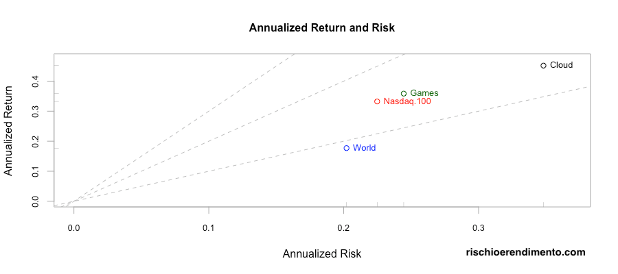 Concludo con il grafico del rischio (inteso come volatilità) e rendimento calcolati su base annuale nel quale vediamo che, dalla quotazione, il rendimento del WisdomTree Cloud Computing sia proprio di un prodotto aggressivo che punta a sovraperformare l’indice mondiale e anche quello tecnologico, subendone la maggiore volatilità.