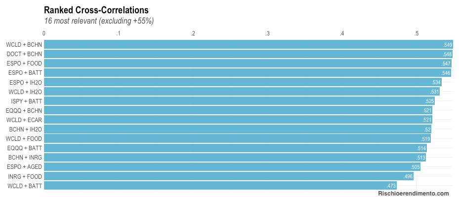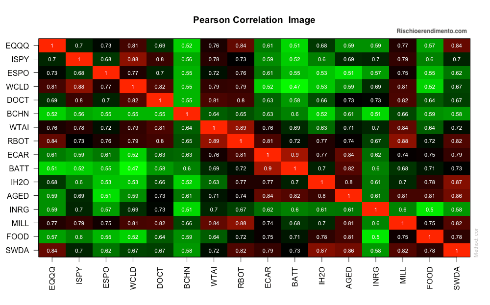 Notiamo che col passare del tempo si assiste a una maggiore diversificazione del comportamento dei vari prodotti con un aumento del colore verde ovvero correlazione vicina a 0.5. Prodotti quali L&G Battery Value-Chain, Rize Sustainable Future of Food e Invesco CoinShares Global Blockchain mostrano una bassa correlazione nel periodo con gli altri prodotti.