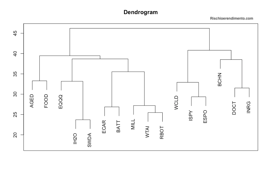 Calcoliamo le distanze e creiamo un diagramma ad albero per proporre una possibile gerarchia degli ETF tematici (basandoci solo sulla correlazione sui rendimenti settimanali, questa analisi puramente matematica va poi analizzata dal punto di vista economico per vedere se ha fondamento).
