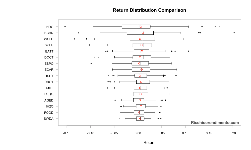 Tutti i tematici mostrano una rischiosità in termini di VaR o di volatilità annualizzata maggiore dei due indici principali. WCLD e INRG si confermano quelli con un maggior rischio in termini di VaR.