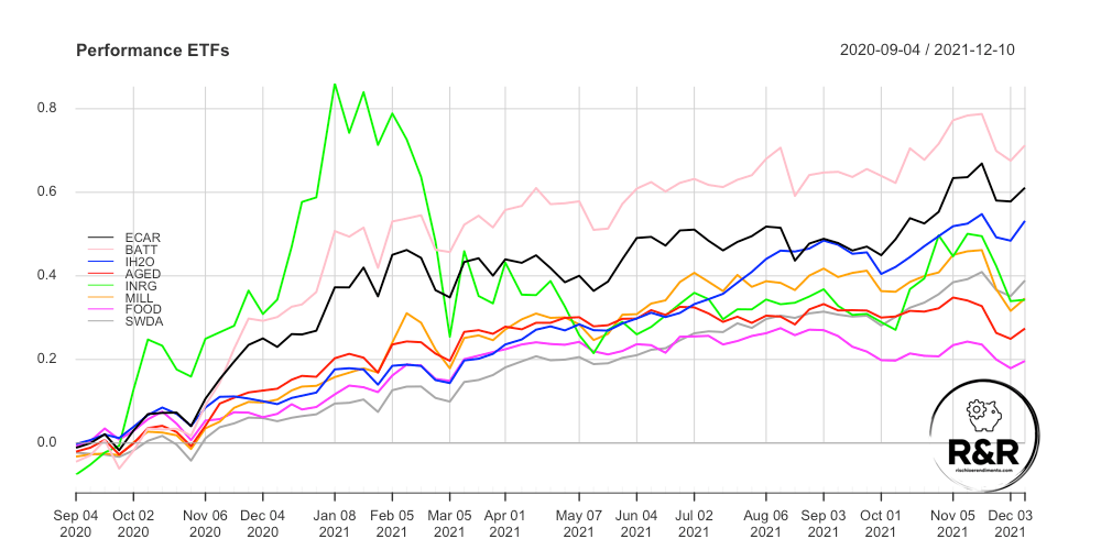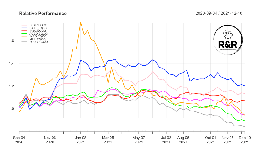 Vediamo come l’iShares Global Clean Energy da marzo si comporti in maniera simile agli altri Megatrend mentre il tema della mobilità elettrica (L&G Battery Value-Chain e iShares Electric Vehicles and Driving Technology) continui a fare bene.