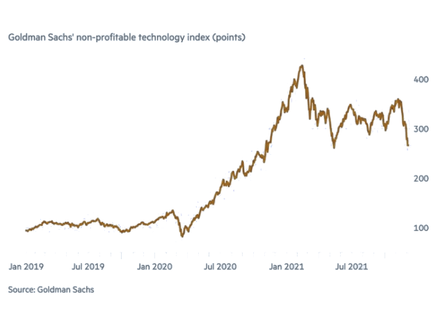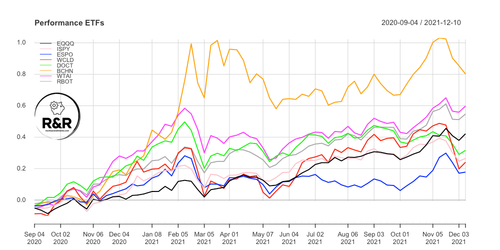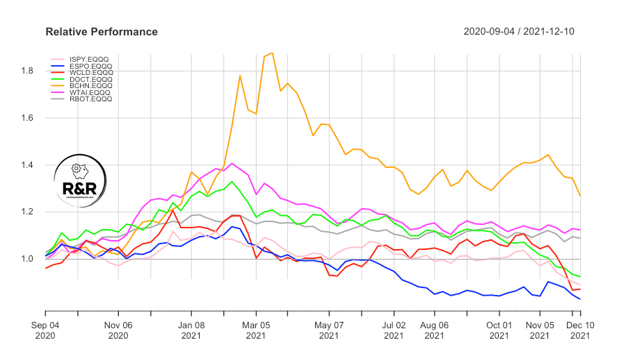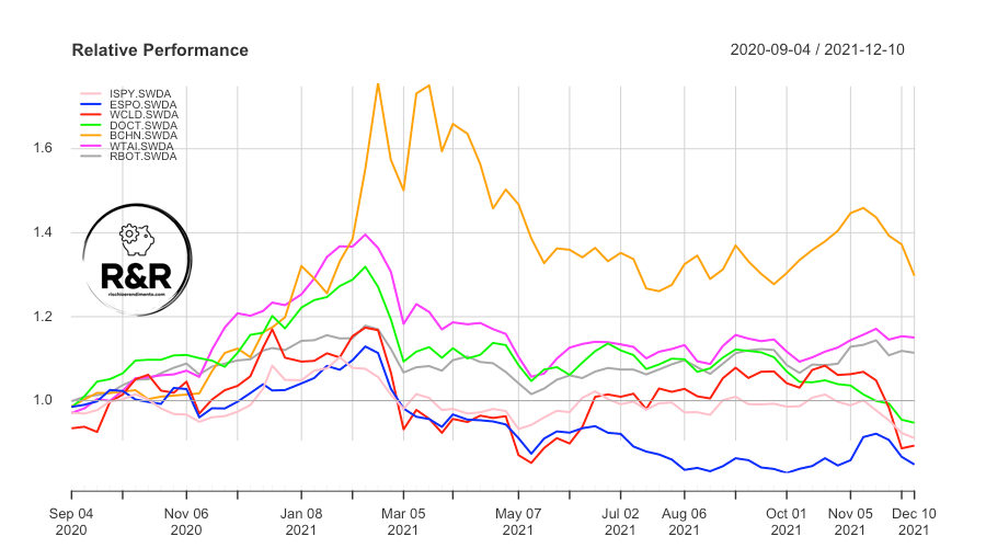 Ultimo confronto dell’anno tra alcuni ETF tematici quotati su Borsa Italiana, in cui continua il contesto di borse americane vicine ai massimi storici e molti temi modaioli sofferenti. Alcune aziende che hanno fatto molto bene nel 2020 (e sofferto dal febbraio 2021) sono società che non fanno (al momento) utili. Goldmans Sachs ha creato un indice per tracciare l’andamento di queste società:
