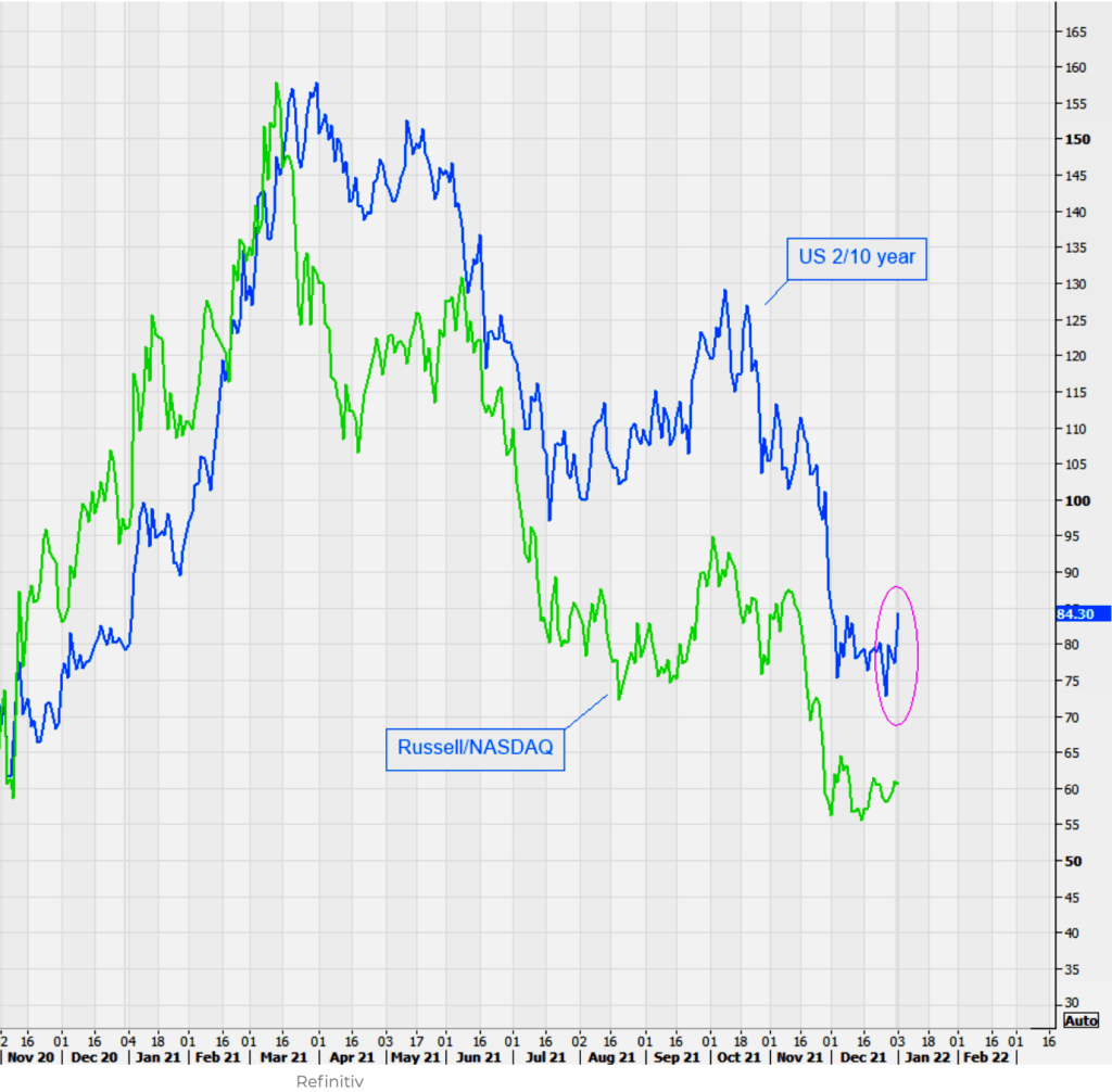 Col grafico delle performance relative si vede meglio come la strategia del Xtrackers Portfolio sia stata prima premiante e poi riassorbita rispetto ai 2 ETF portfolio. Questo andamento ricorda quello del rapporto Russel2000/Nasdaq e del rapporto tassi 2y/tassi 10y USA con il picco nel primo trimestre.