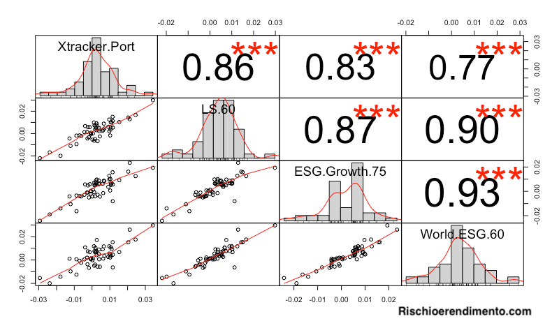 La correlazione è più alta tra il Vanguard LifeStrategy 60% e l’Xtrackers Portfolio che si dimostra il meno correlato con gli altri prodotti. Ricordo che prendere un X% azionario +100-X% di cash (rend. e vol. pari a 0) non cambia i valori di correlazione.