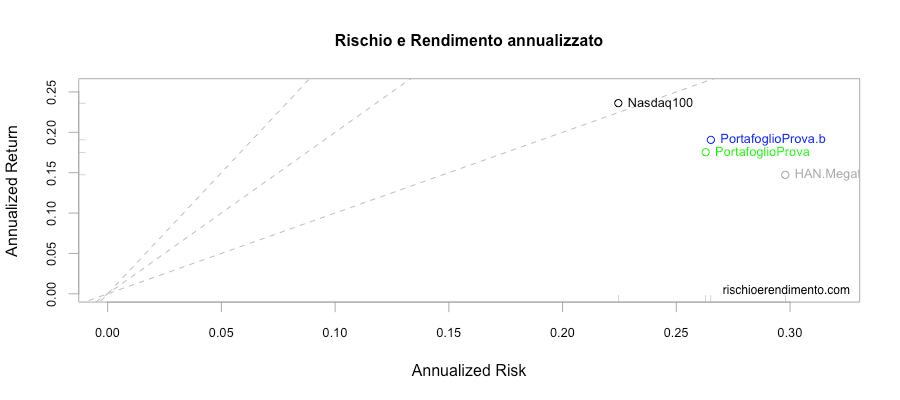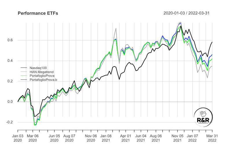 Confronterò l’HANetf Tech Megatrend con 2 portafogli prova, i quali non tengono conto però di commissioni ed eventuale tassazione proventi nei ribilanciamenti e servono più come benchmark per questo prodotto che come esempio di portafoglio di ETF tematici.