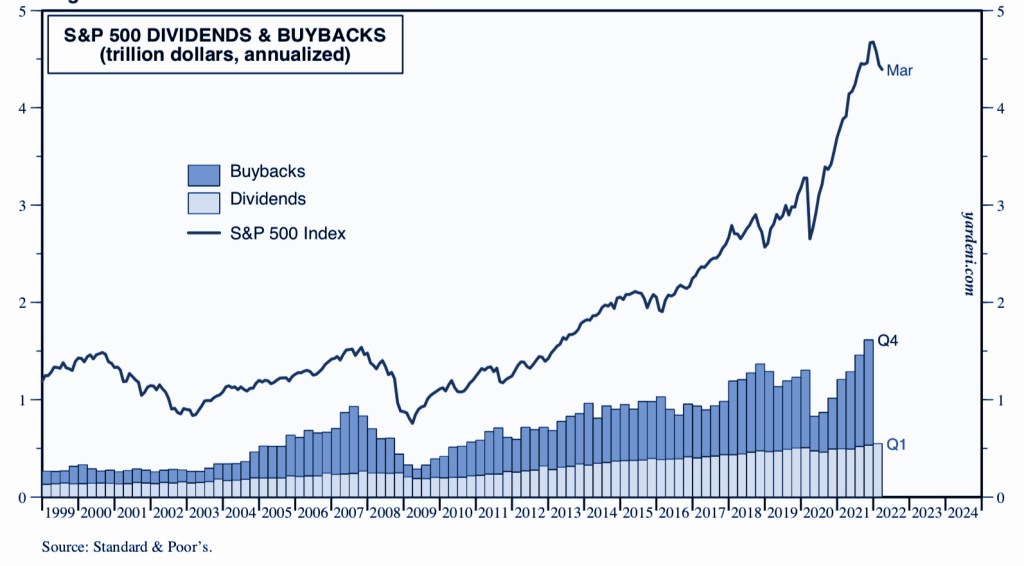 Nell’immagine sottostante vediamo come i buybacks siano ritornati a salire raggiungendo i 1200 miliardi di dollari. Questa quantità di denaro certo non sposta gli equilibri del mercato ma sicuramente può aiutare.
