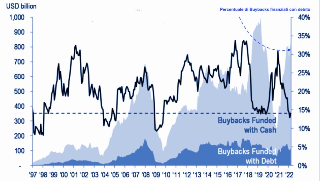 Nel tempo la percentuale di Buybacks a debito per le aziende americane è variabile con una media del 23%. Nell’ultimo periodo la percentuale è inferiore (circa il 15%).