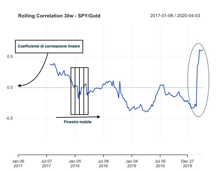 Se analizziamo i un sottogruppo di dati (una finestra) e poi muoviamo la finestra nel tempo possiamo vedere la come cambi il coefficiente di correlazione, si parla in questo caso di rolling correlation (a finestra mobile). Vediamo un esempio in cui la finestra è di 30 settimane (30w).